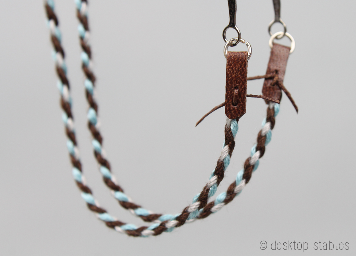 The reins were made with a four strand round braid, and are attached with tiny leather laces.