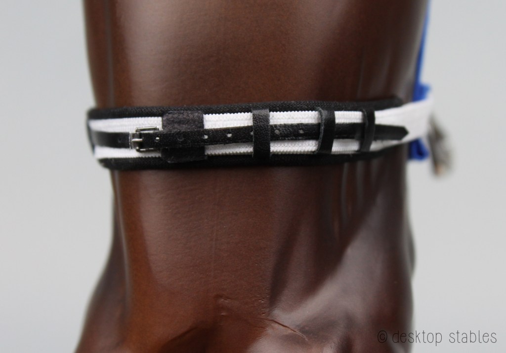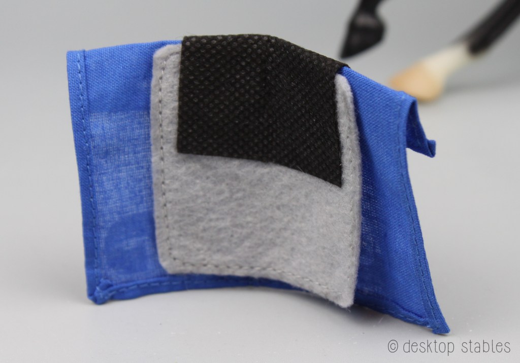 The black piece is cut from part of a reusable shopping bag… I think this material is non-woven polypropylene? It’s thin and doesn’t fray. I was trying to imitate a non-slip type of fabric in miniature. I noticed that a lot of horses have some sort of material folded here… a towel, chamois, or something similar.