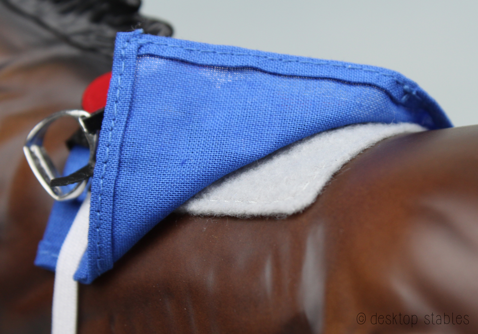 Underneath is a square of grey felt. I rounded the corners and stitched around the edge to make it look more finished. This varies a lot on real horses too… I’ve seen simple foam pads to thicker padded ones. And weight cloths sometimes?