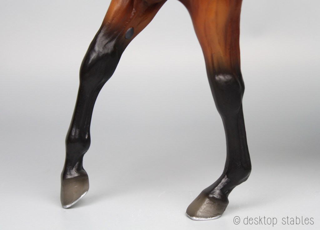 The chestnuts on mine were missing, so I broke out the paint and filled those in. While I was at it, I touched up some eartip rubs and painted his shoes. It bothers me when Breyers have sculpted shoes but they aren’t painted. 😄